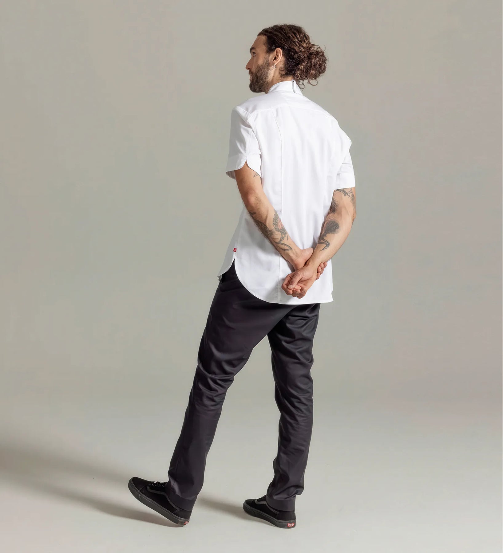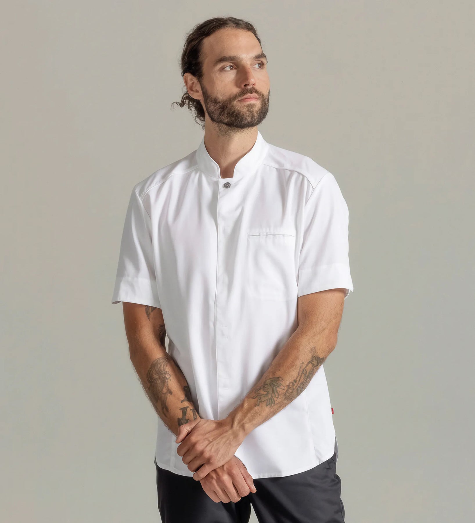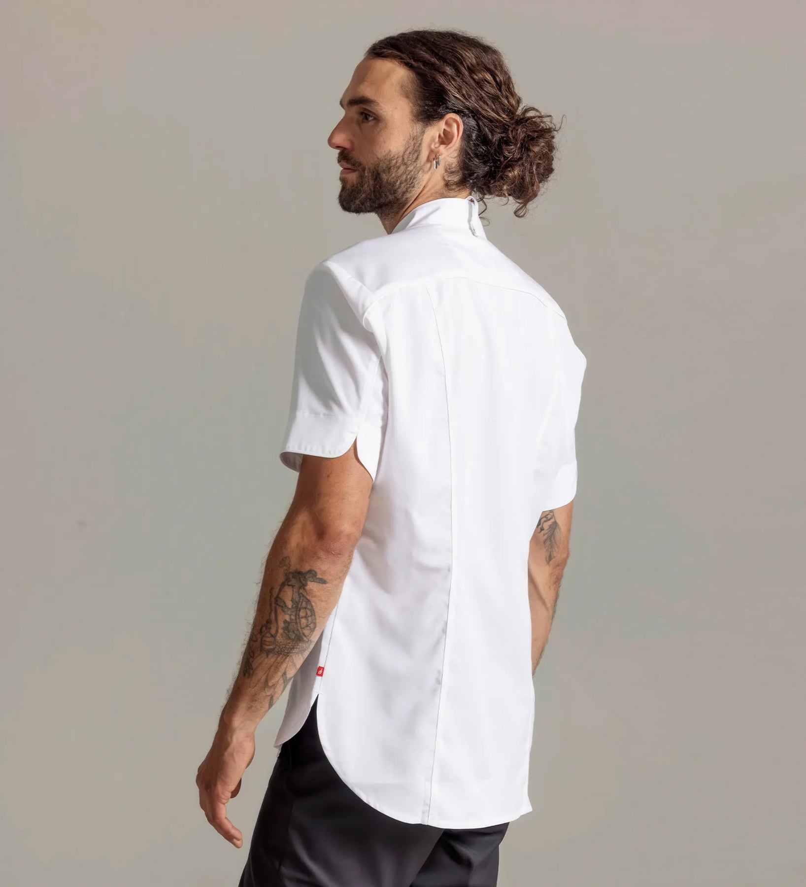 Moderne koksbuis voor heren met korte mouw en iets smallere pasvorm. Het model is geïnspireerd op een overhemd en heeft dus een afgeronde onderkant en is iets langer aan de achterkant.