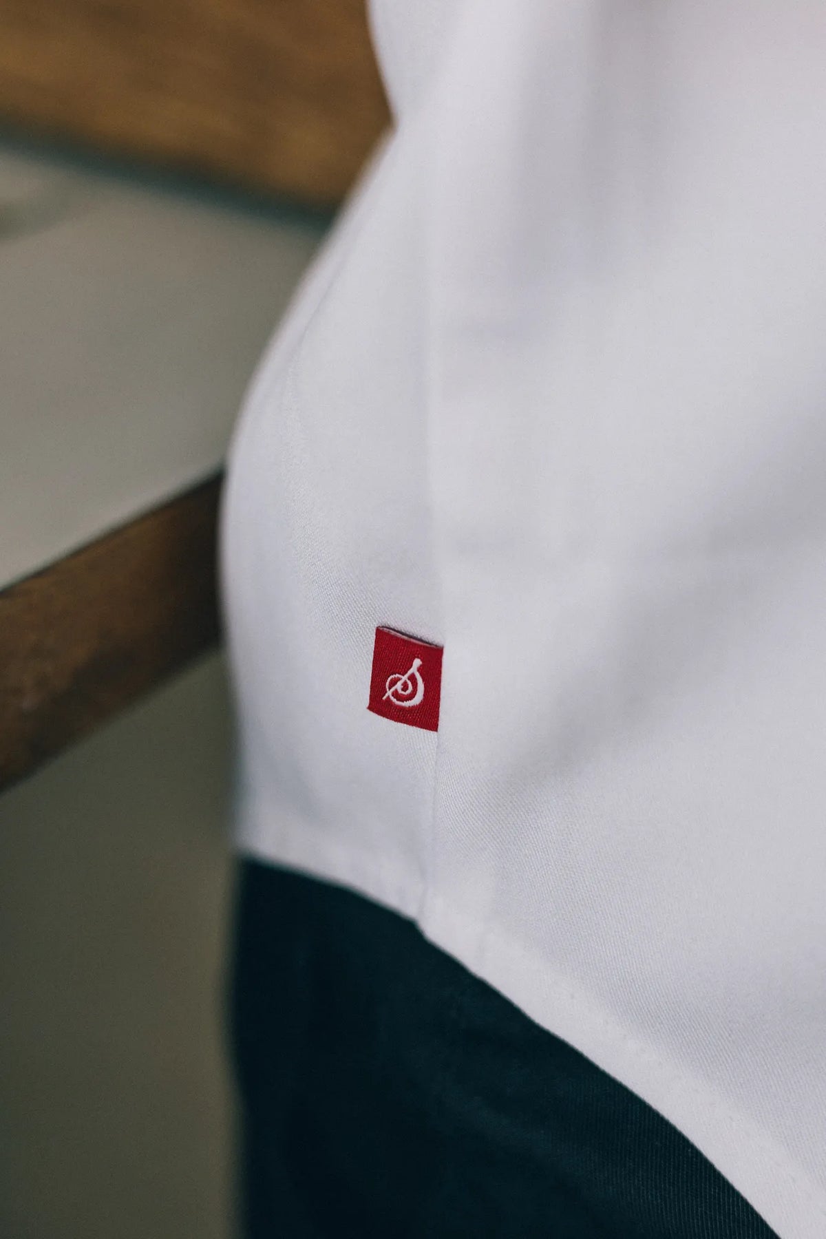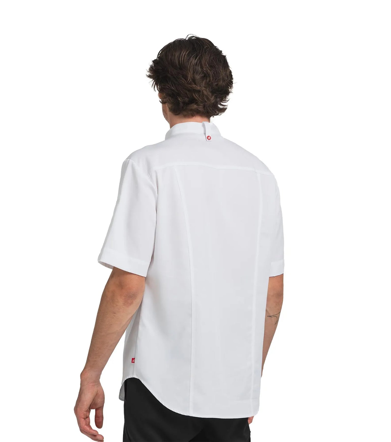 Een net hybride hemd dat zowel in de keuken als in de bediening gedragen kan worden. Pennenzakje op de mouw. Schortlus in de nek. Uniseks-pasvorm met afgerond onderlangs en langere achterkant.