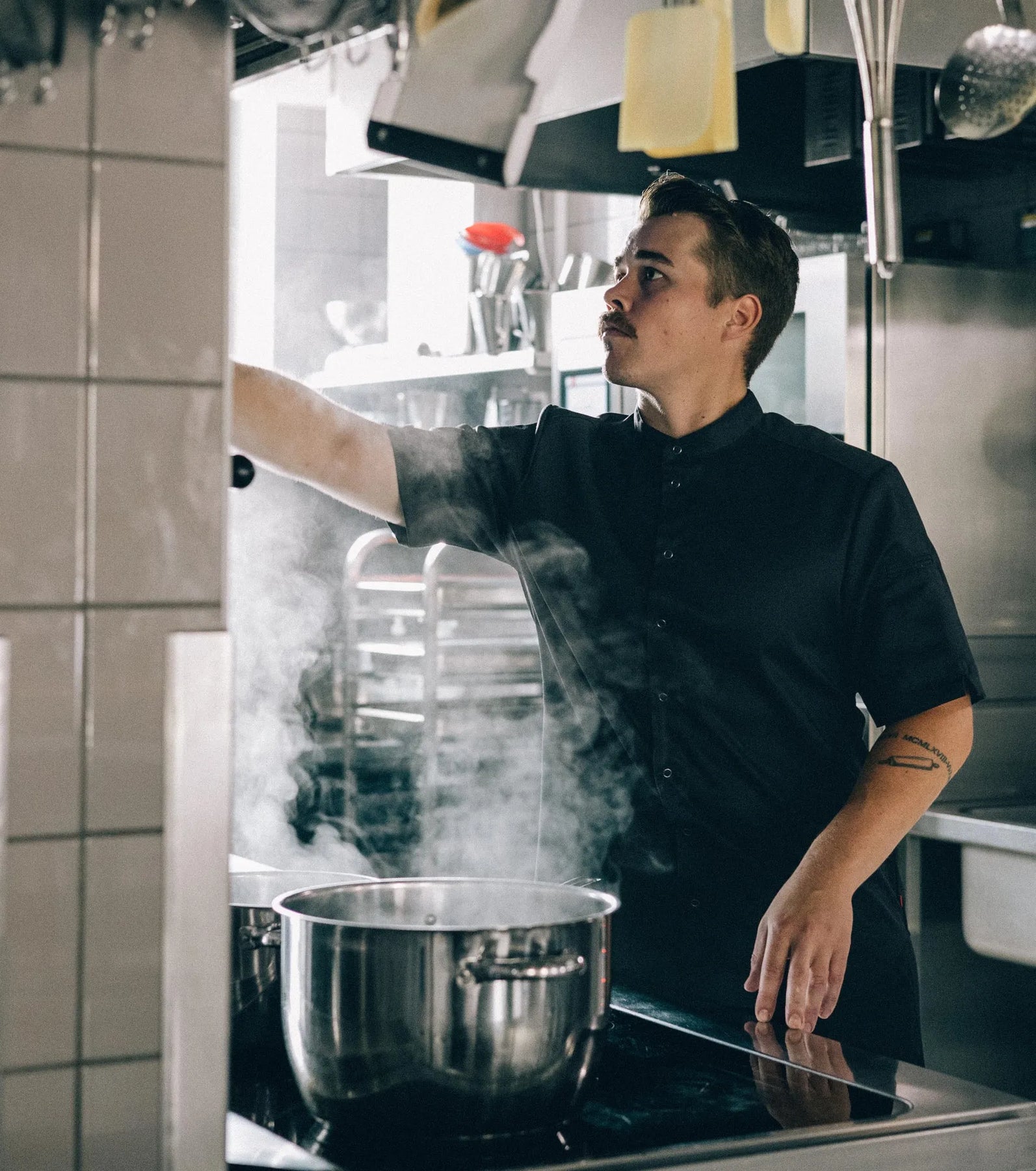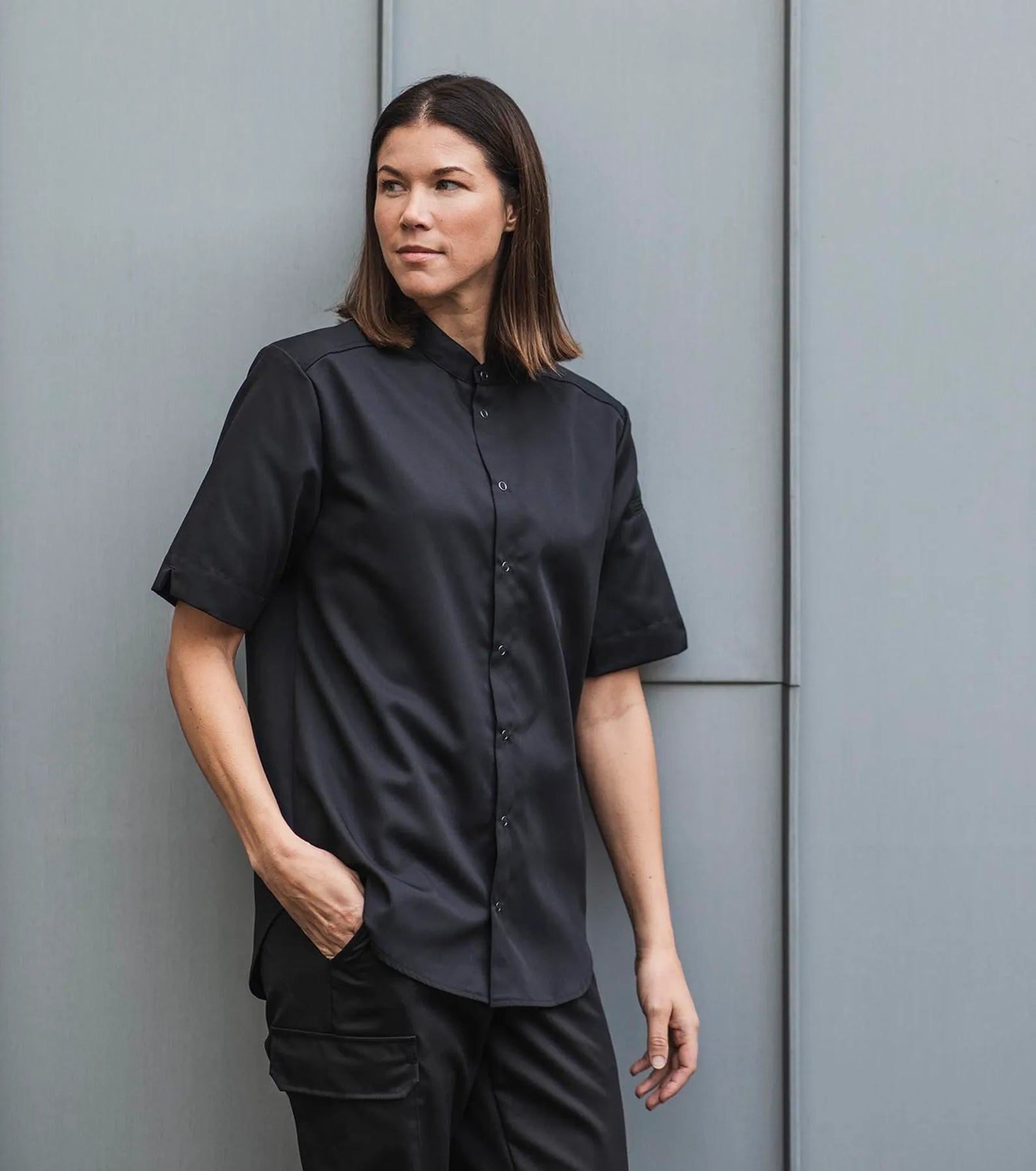 Een net hybride shirt die net zo geschikt is in de keuken als in de bediening.
