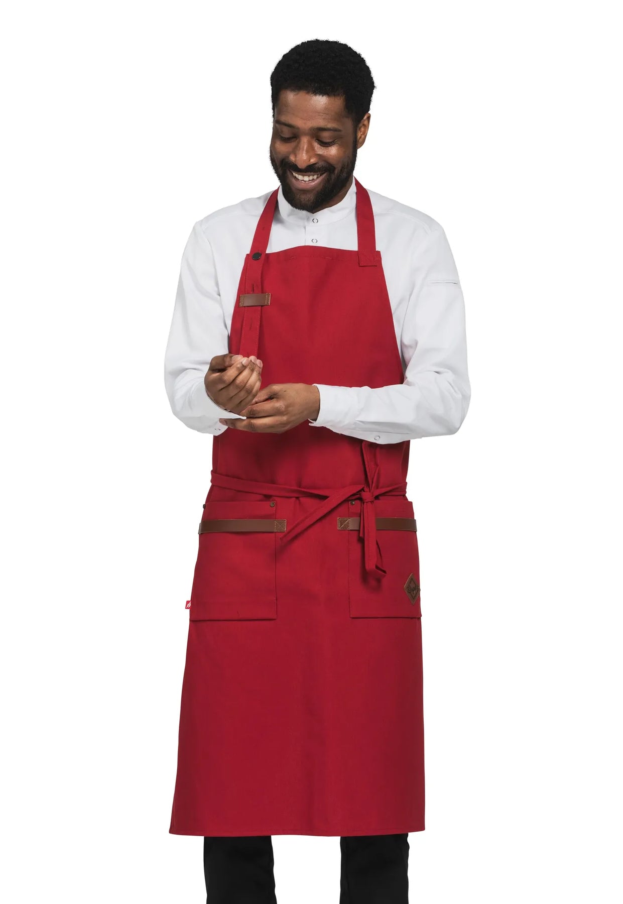 Rustiek schort van een sterke canvas stof. Stijlvolle wasbare nep leer-details op zakken en op de borst. Ruime zakken waar je het nep leer-detail kunt gebruiken om een keukendoek aan te hangen. Verstelbare lengte van de band rond de nek, vaste band in de taille voor een knoop voor of achter. Een schort dat zowel stijlvol als handig is voor keuken/bediening/bar of andere ambachtelijke beroepen.