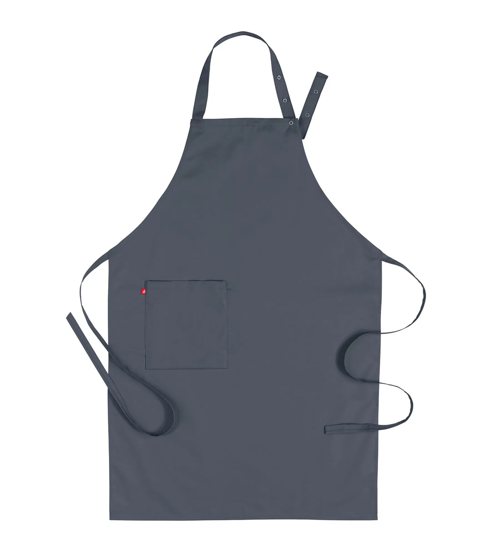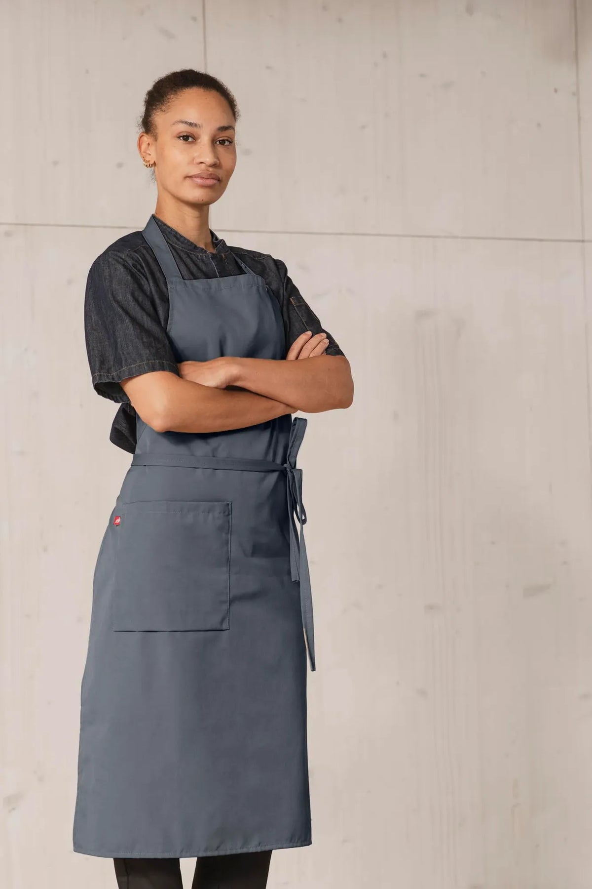 Schort in klassiek model met nekband en ruime zak aan de rechterkant.