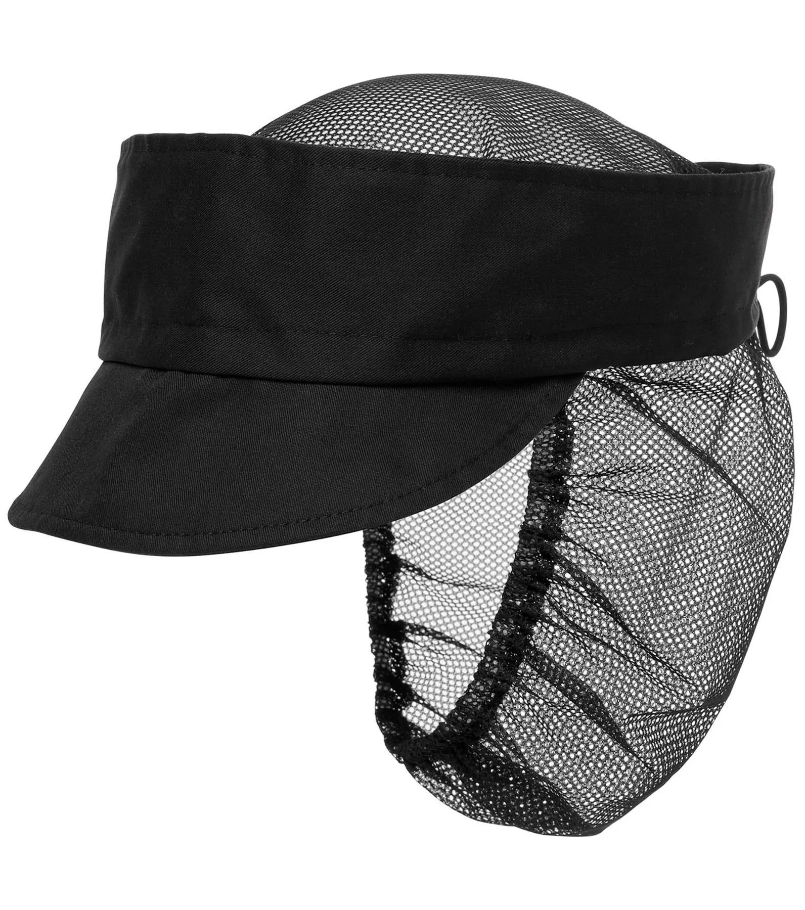Cap with mesh top, adjustable drawstring and stopper