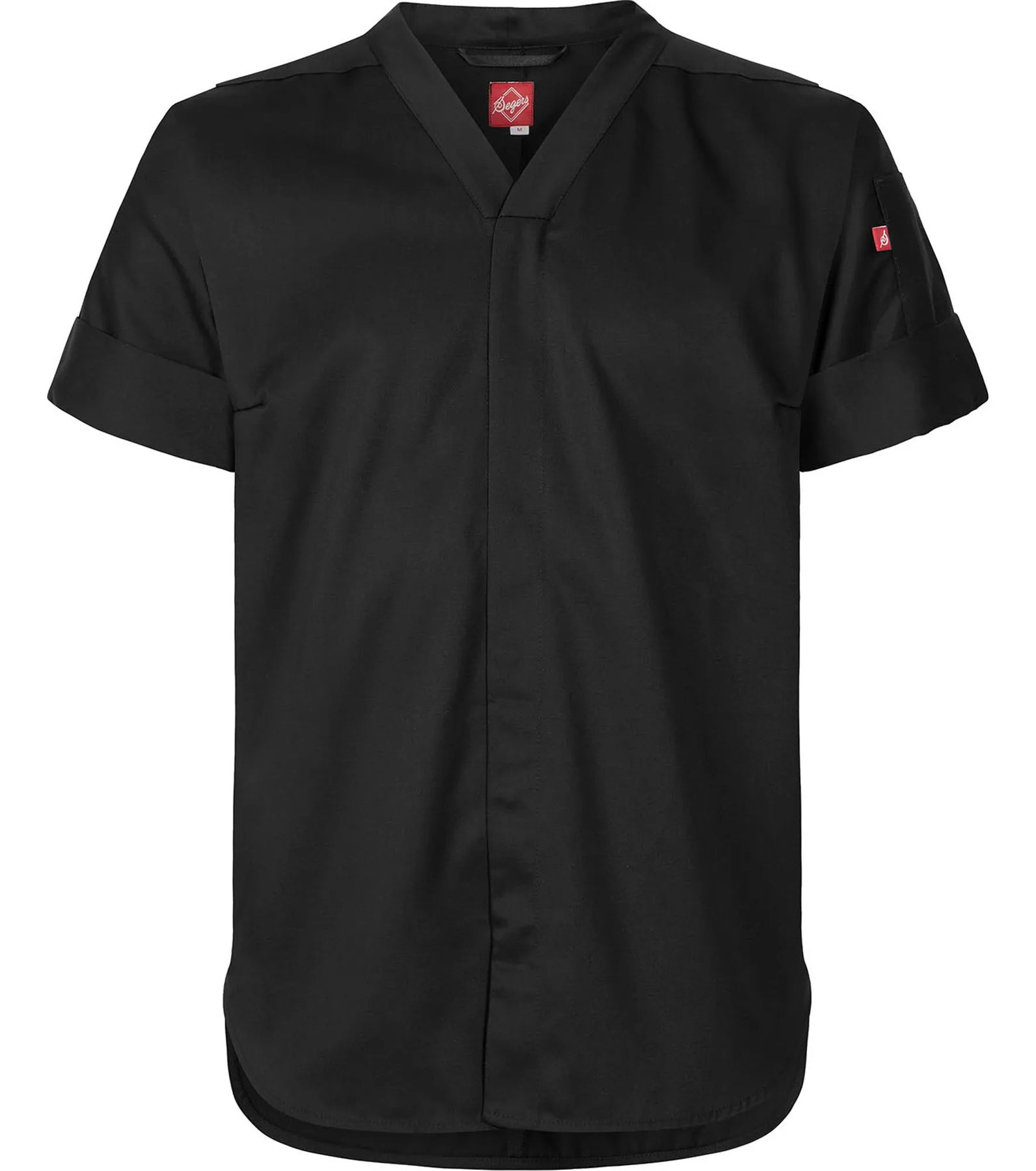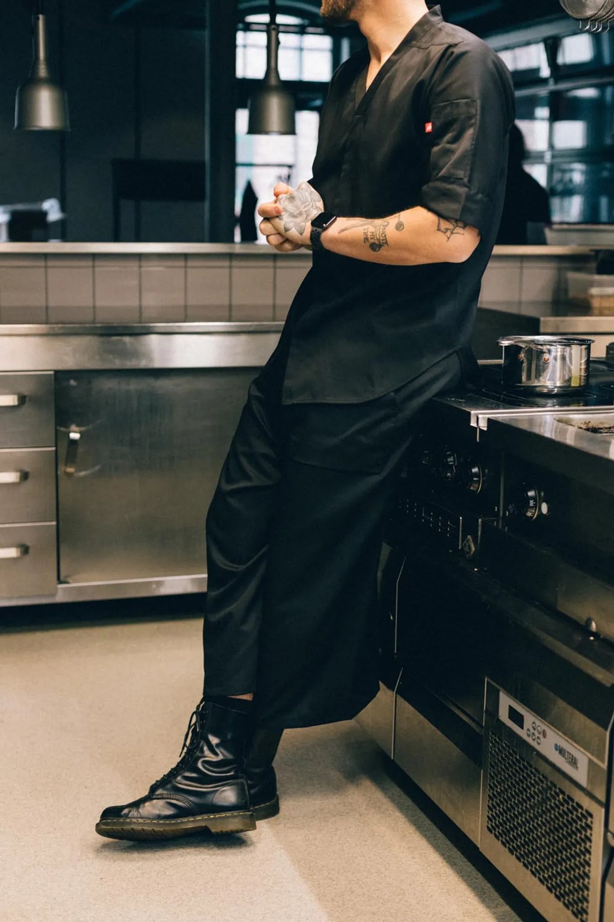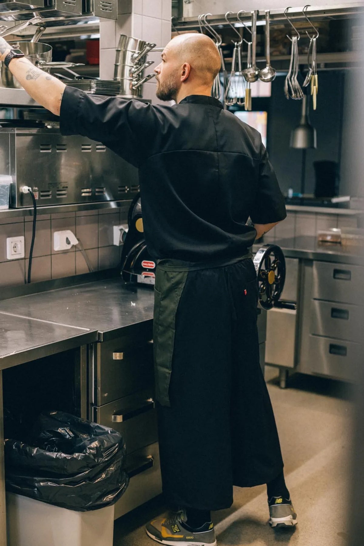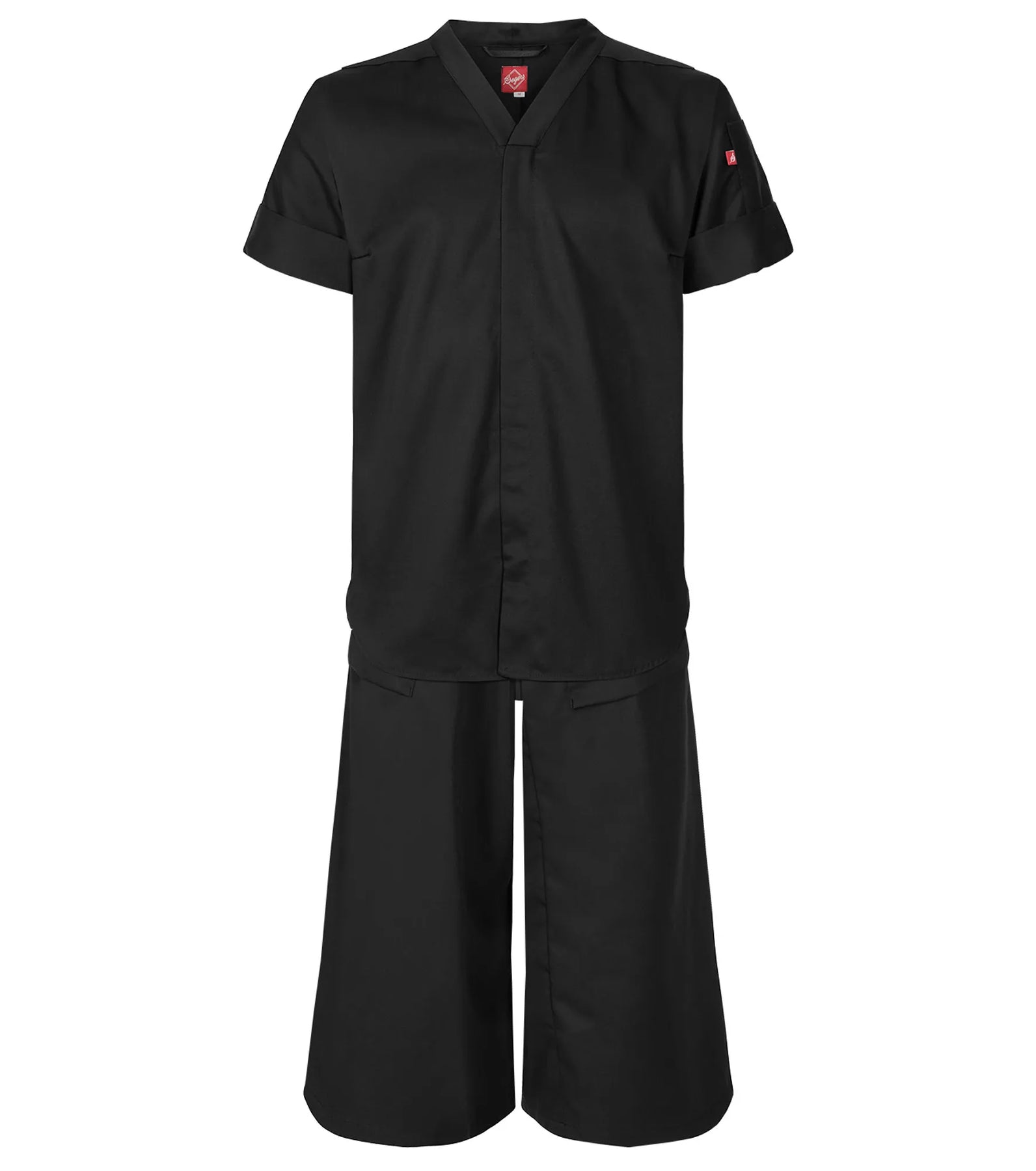 Asian-inspired, short-sleeved chef coat and ¾-length trousers, both in recycled material and designed to minimise fabric waste in production. With its design and unique material, the product is not only light and comfortable to wear, but also saves resources by recycling waste material.
