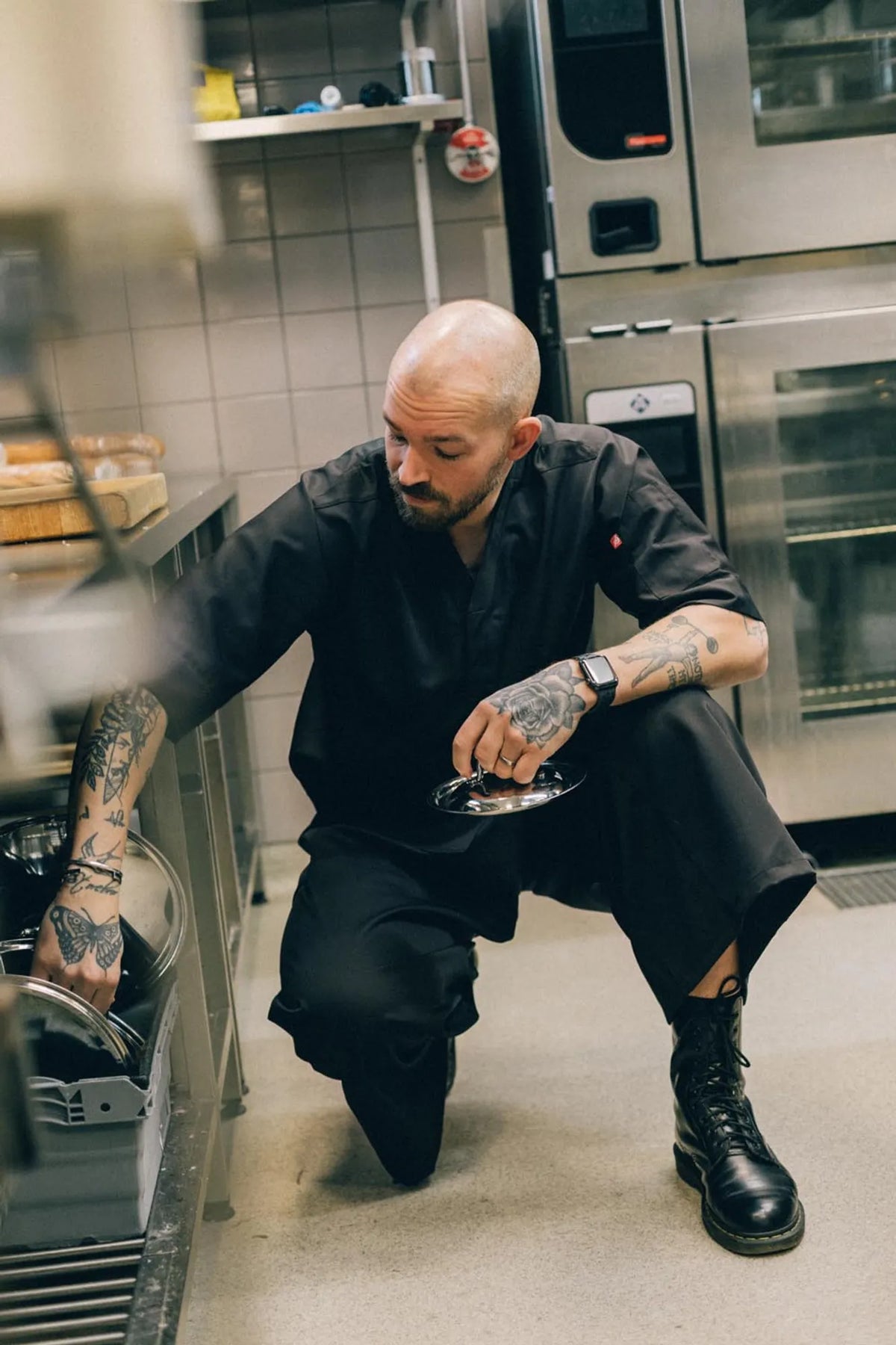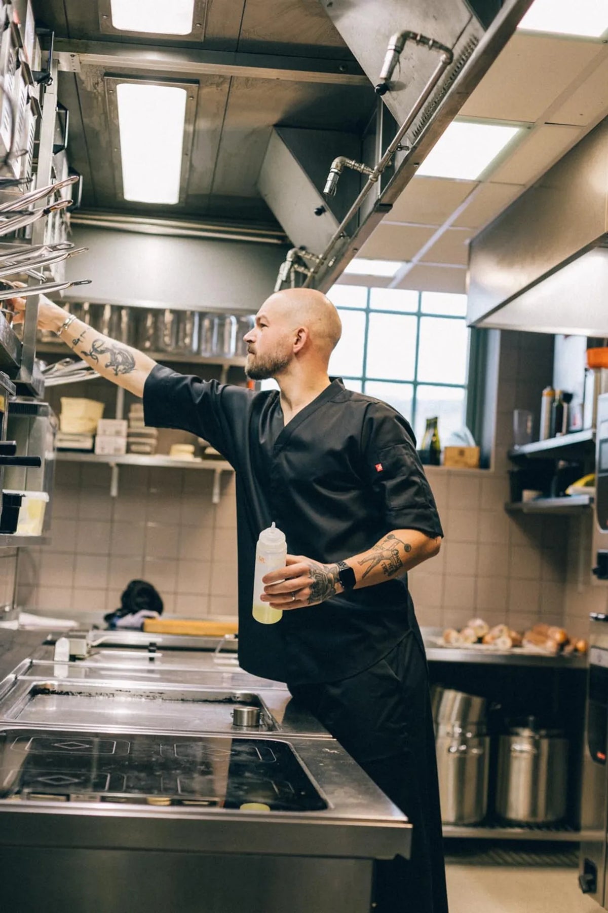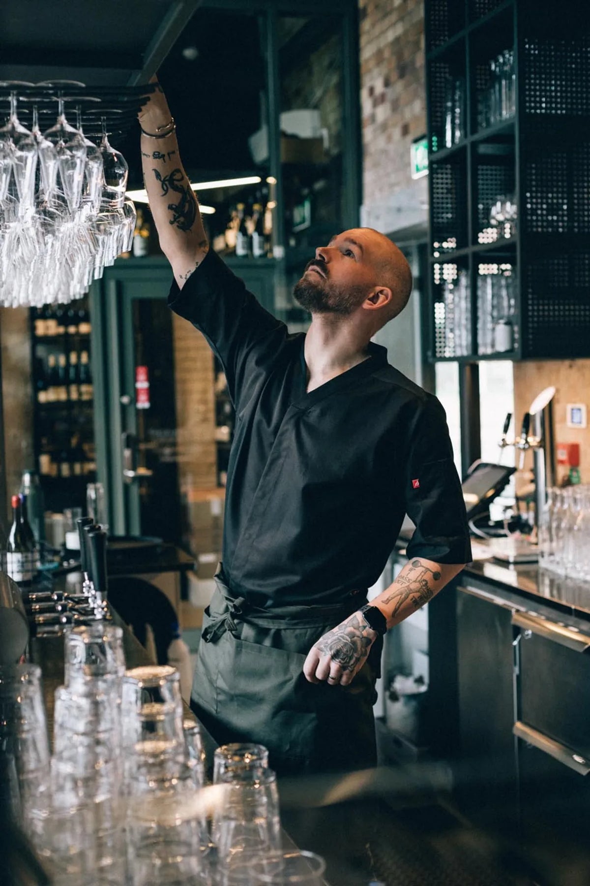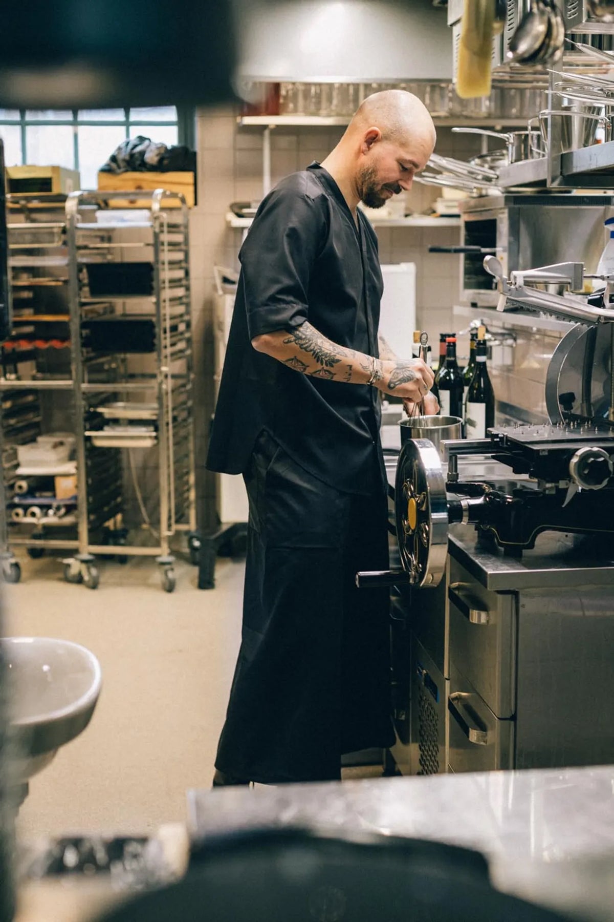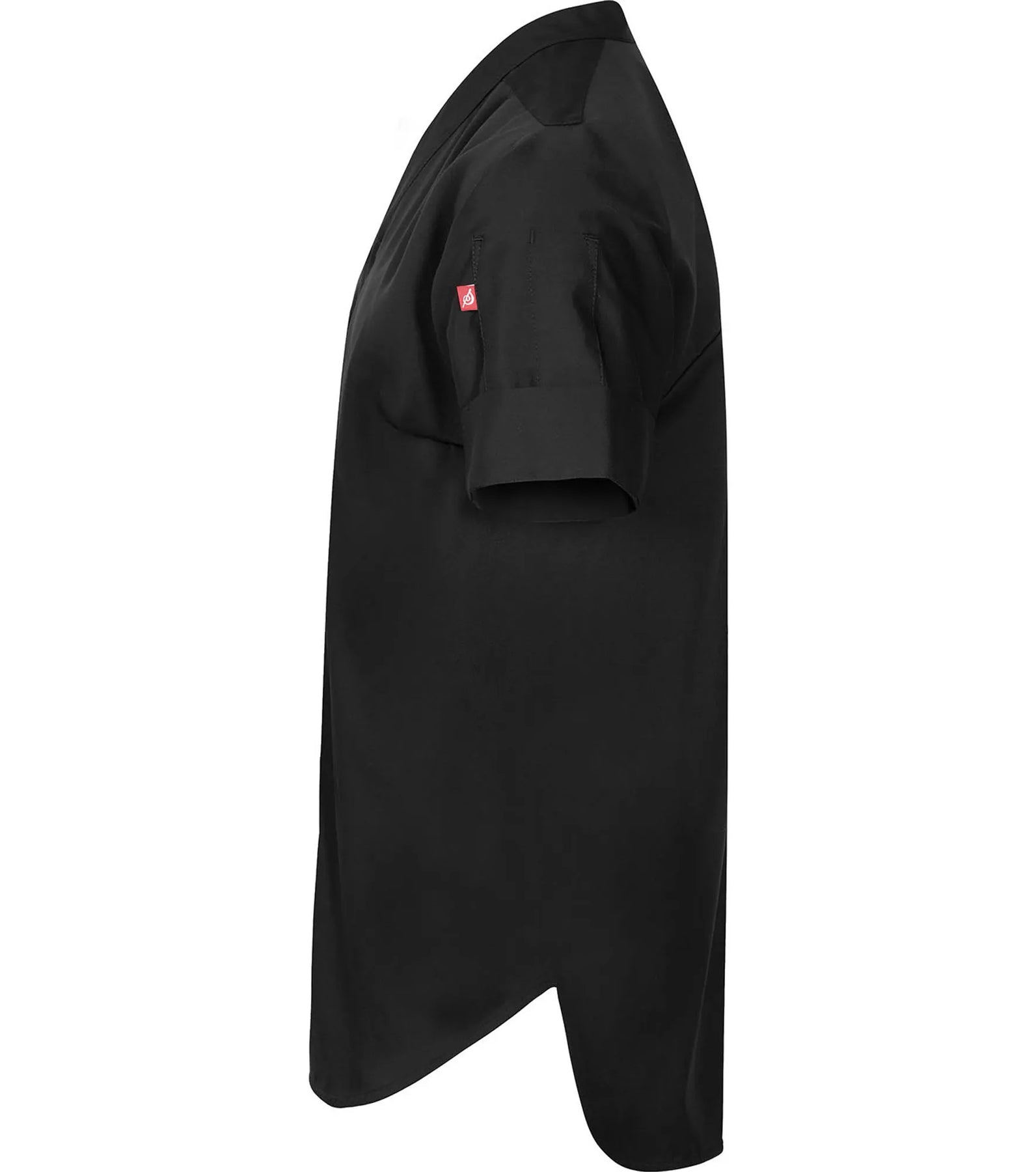 Asian-inspired, short-sleeved chef coat and ¾-length trousers, both in recycled material and designed to minimise fabric waste in production. With its design and unique material, the product is not only light and comfortable to wear, but also saves resources by recycling waste material.