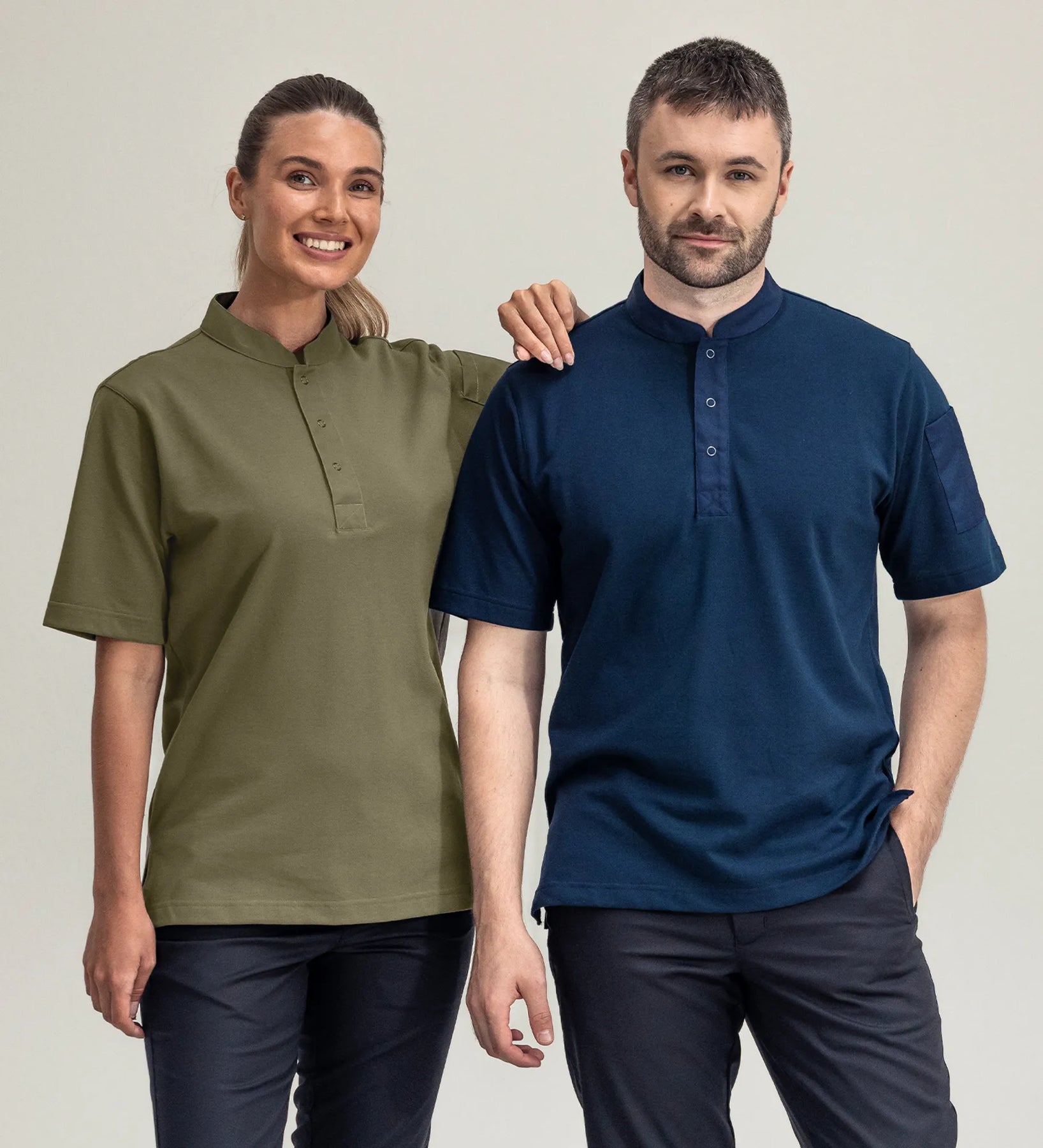 Polo shirt with woven collar and details, suitable for kitchen and serving staff. Unisex styling and a comfortable fit. Pen pocket on one sleeve and snap fasteners at the front. Loop in the collar for bib apron.