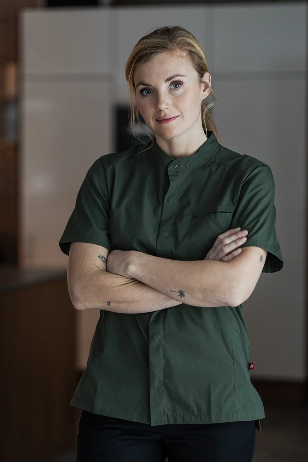 A chef shirt in a unisex design, inspired by the world of sports. The concealed mesh panel in the back and the thin stretch fabric make this shirt airy and cool. Minimalist design