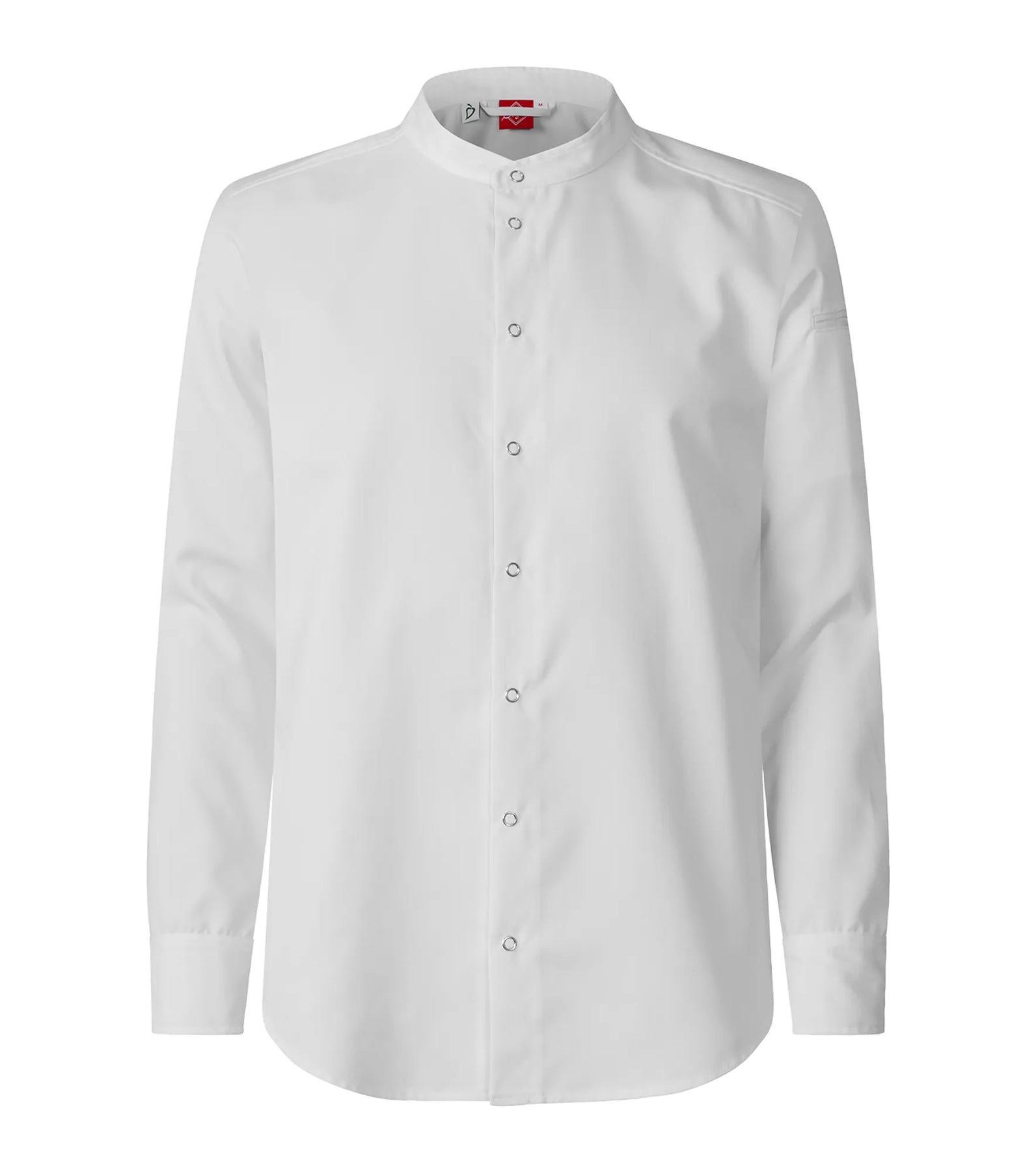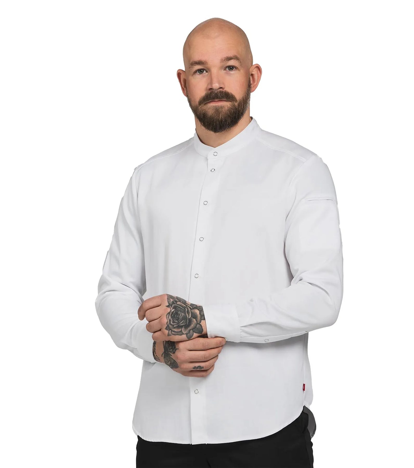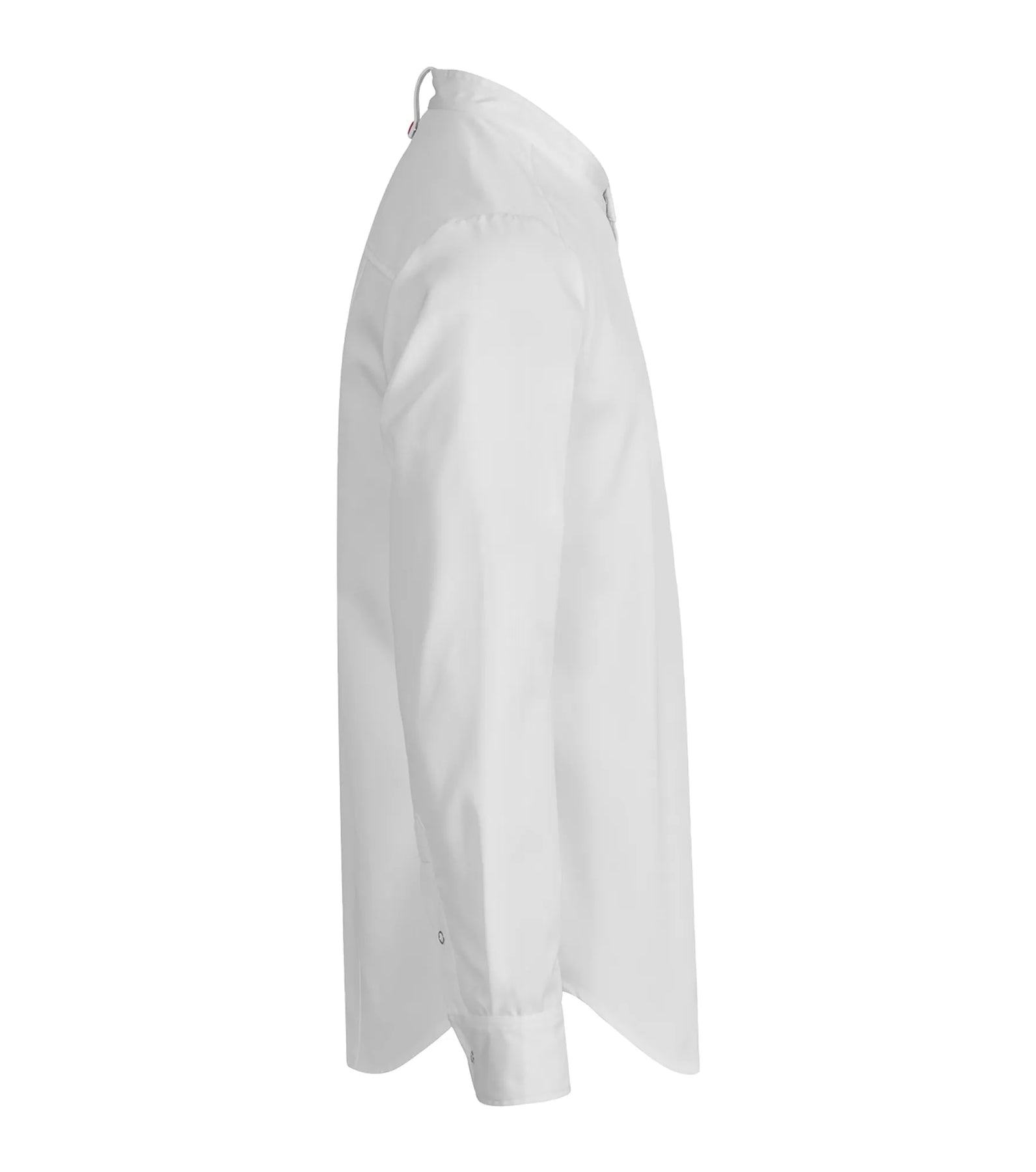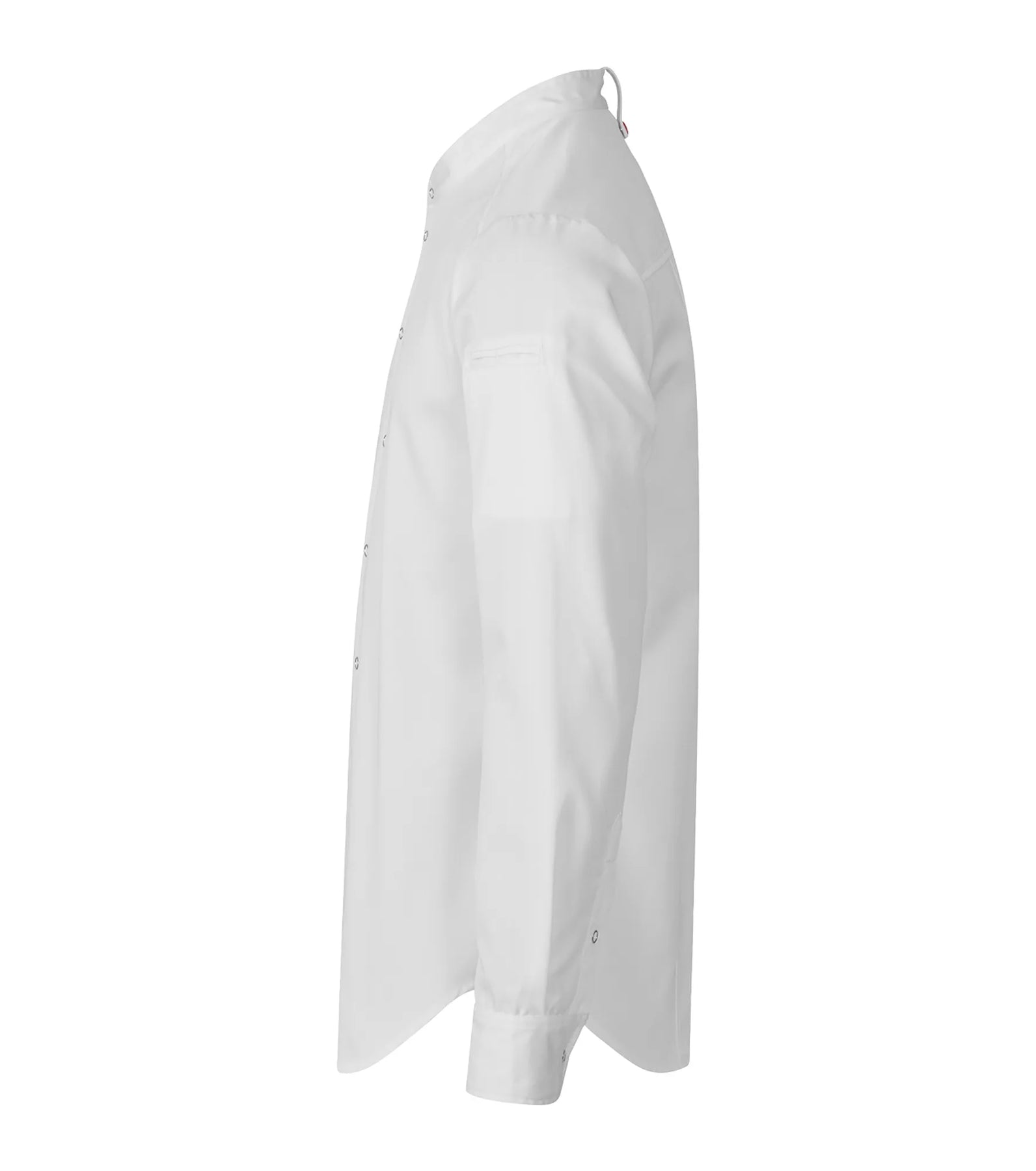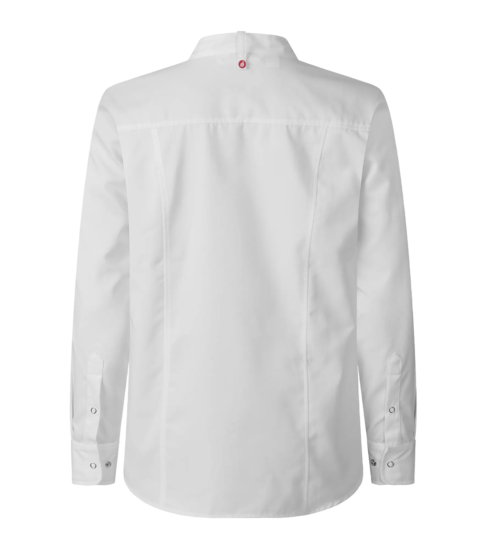 Dressy hybrid chef shirt suitable for both kitchen and waiting staff. Pen pocket on one sleeve. Apron loop in the collar. Unisex fit with rounded hem and longer at the back.