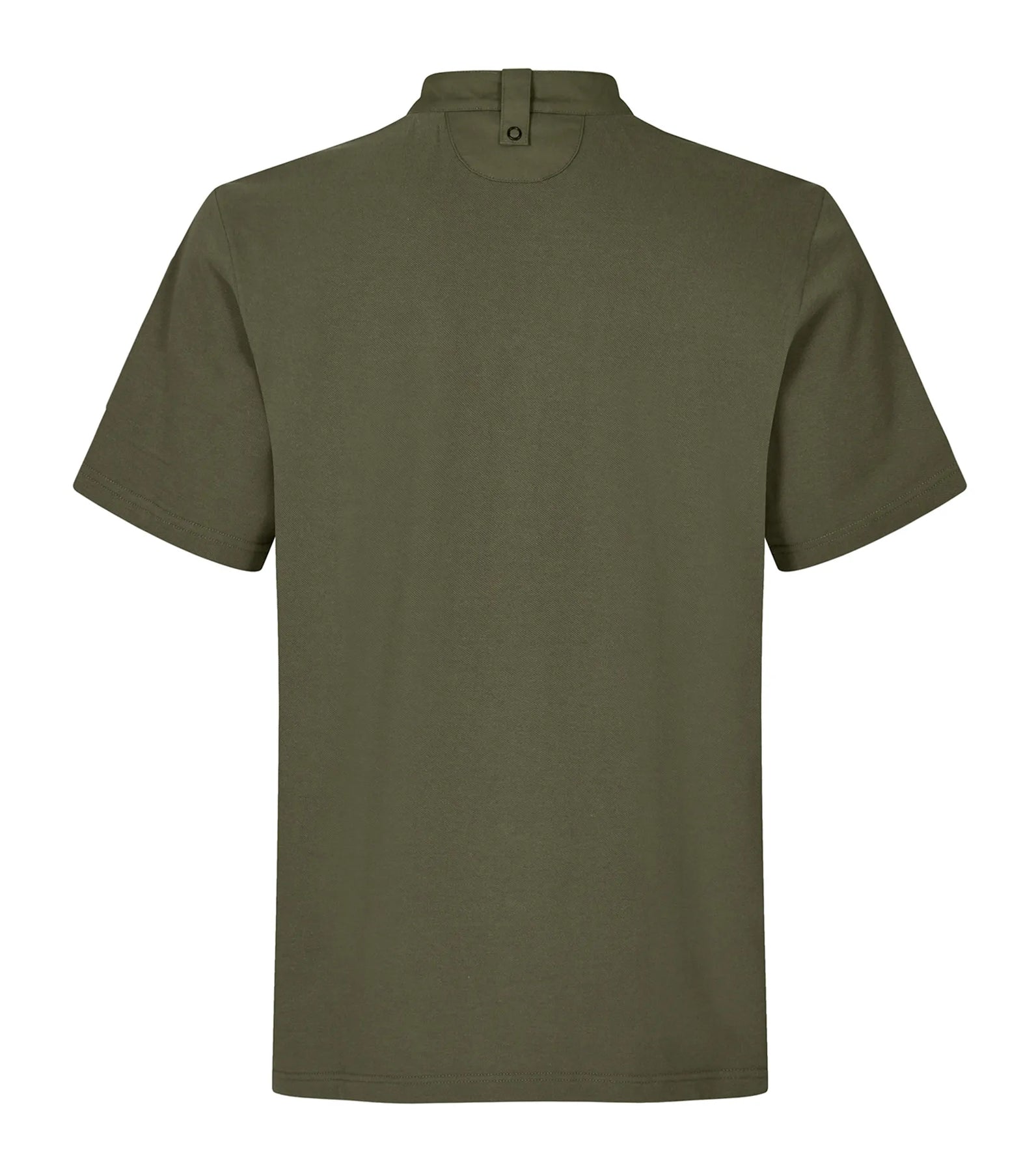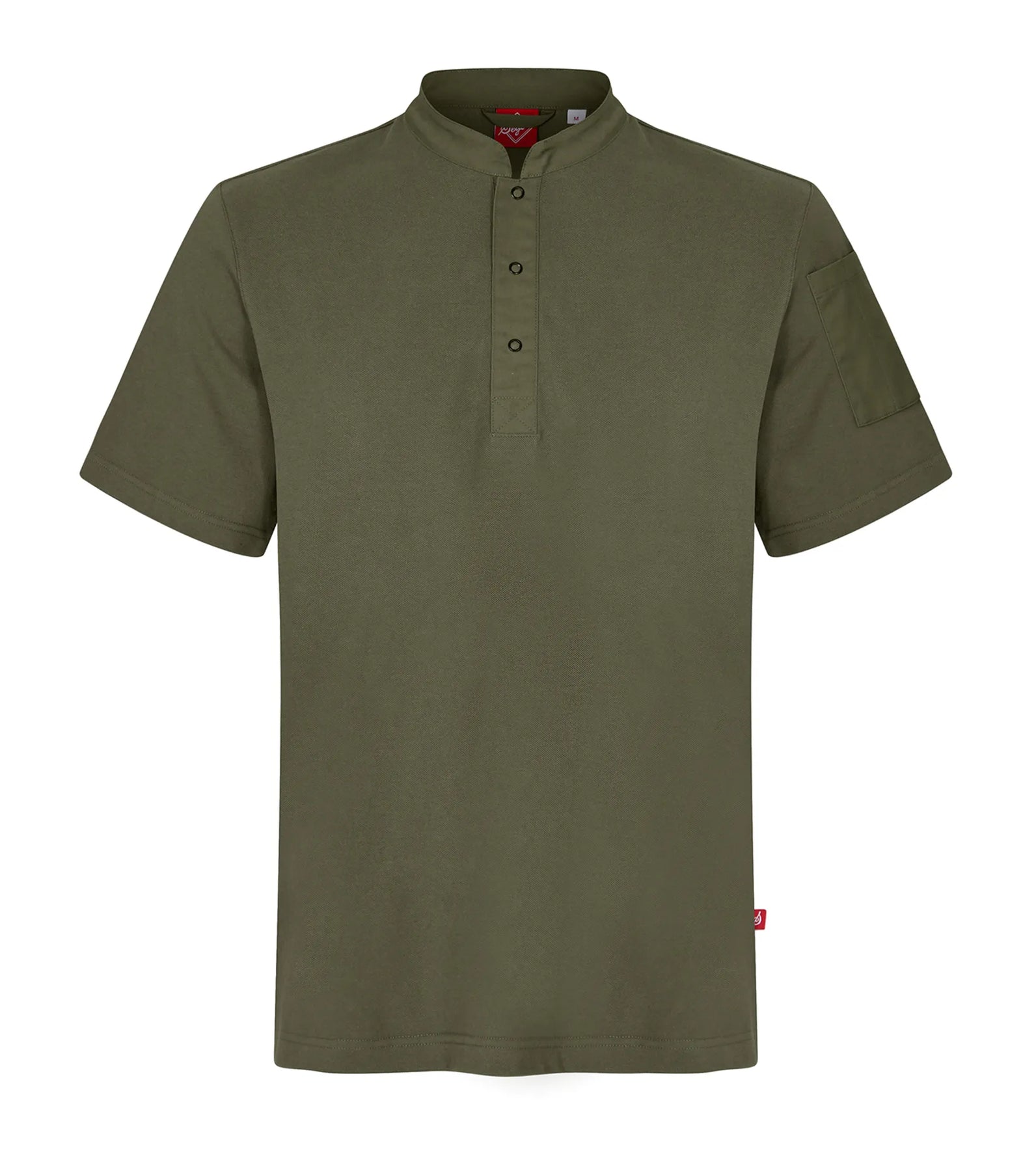Polo shirt with woven collar and details, suitable for kitchen and serving staff. Unisex styling and a comfortable fit. Pen pocket on one sleeve and snap fasteners at the front. Loop in the collar for bib apron.
