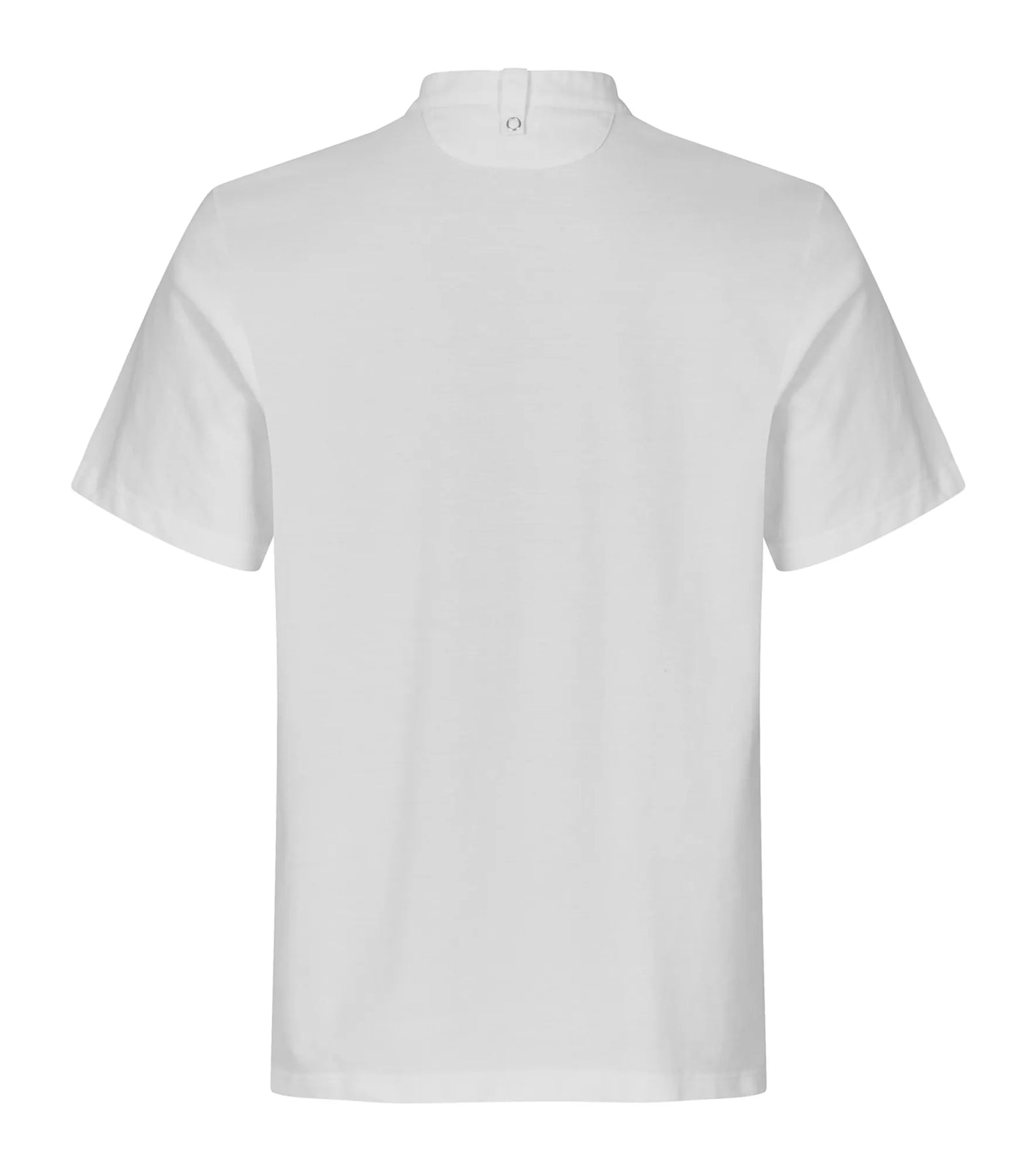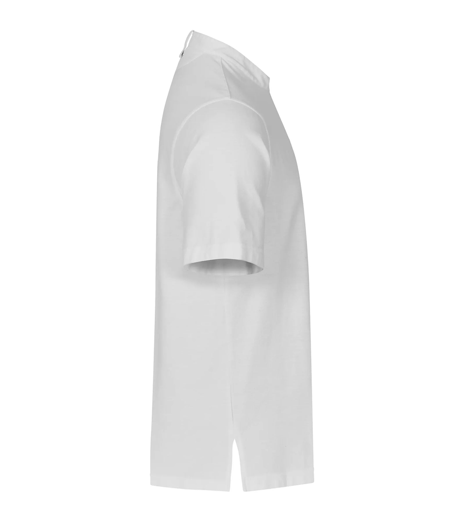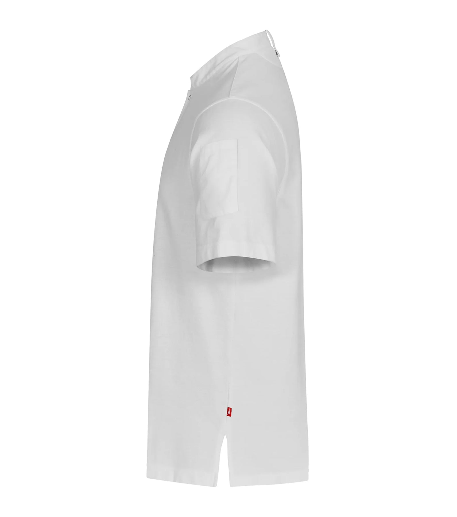 Polo shirt with woven collar and details, suitable for kitchen and serving staff. Unisex styling and a comfortable fit. Pen pocket on one sleeve and snap fasteners at the front. Loop in the collar for bib apron.