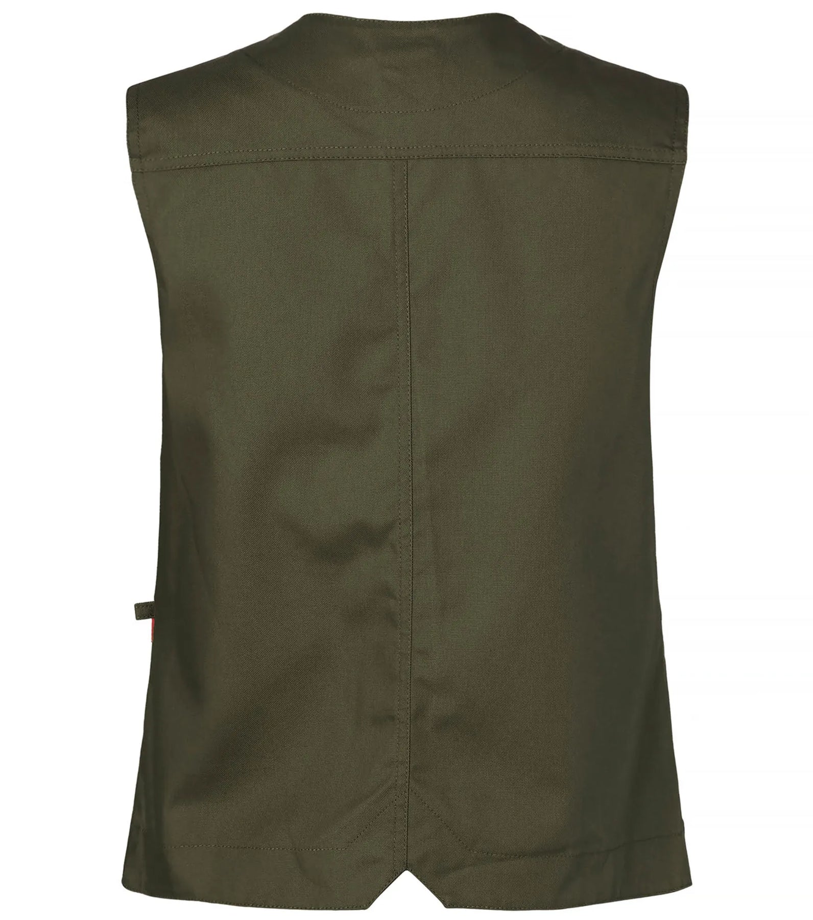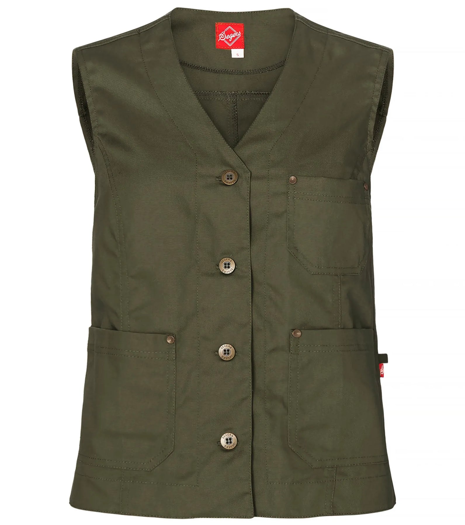 Women’s waistcoat with side pockets and chest pocket on the left. The length (centre back) for size M is approx. 56 cm.