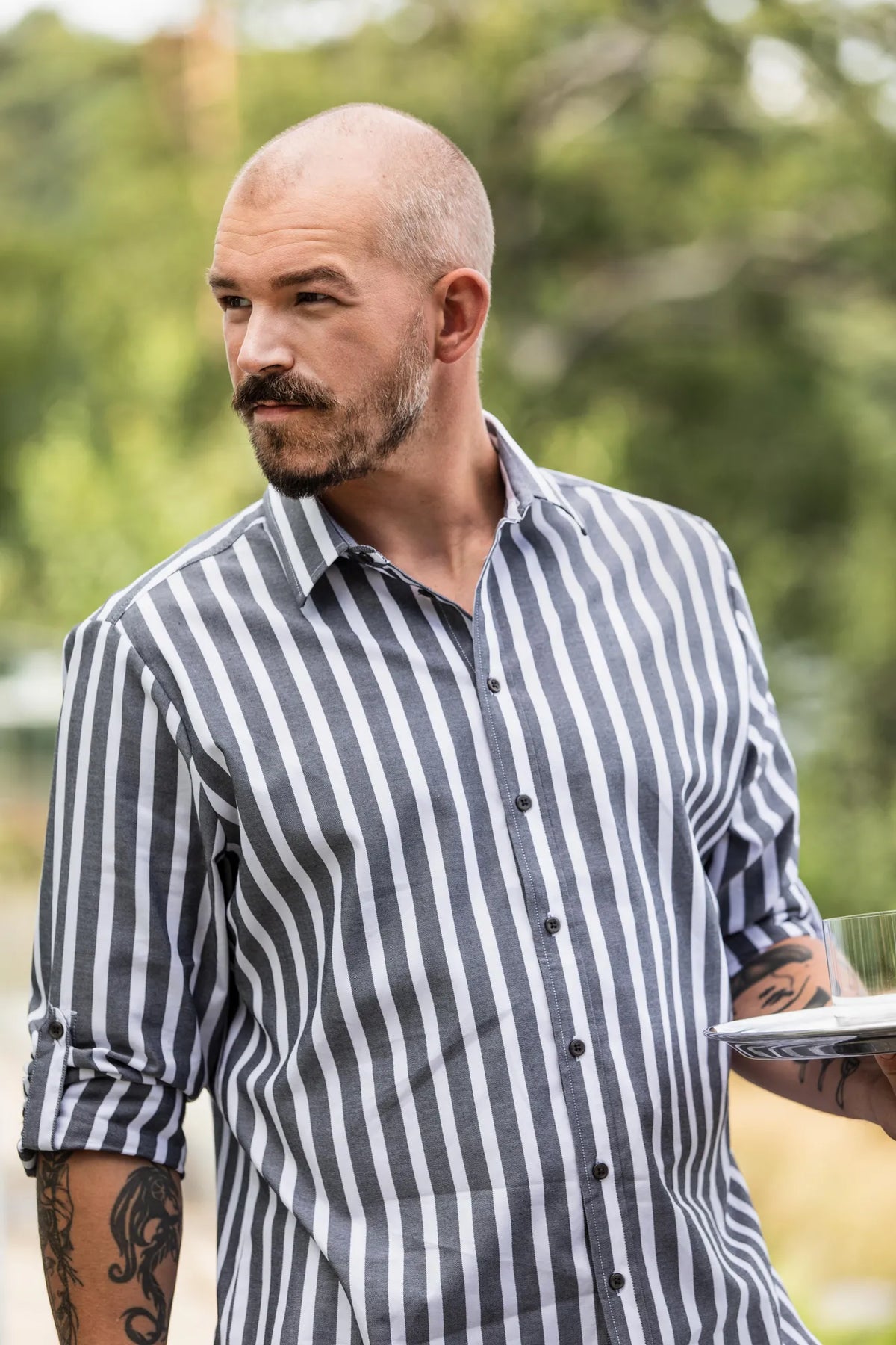 Normal-fit men’s shirt. The shirt has box pleats at the back for range of motion and can be worn loose or tucked in at the waist.