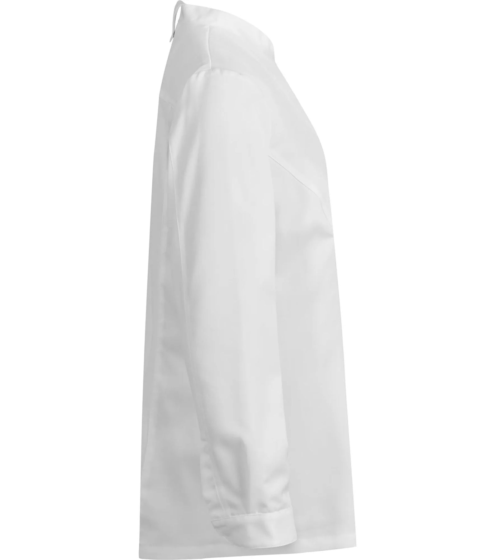 Long-sleeved chef jacket with stretch panels in sleeves and back for improved mobility. This style has a slightly slimmer fit with snap buttons.