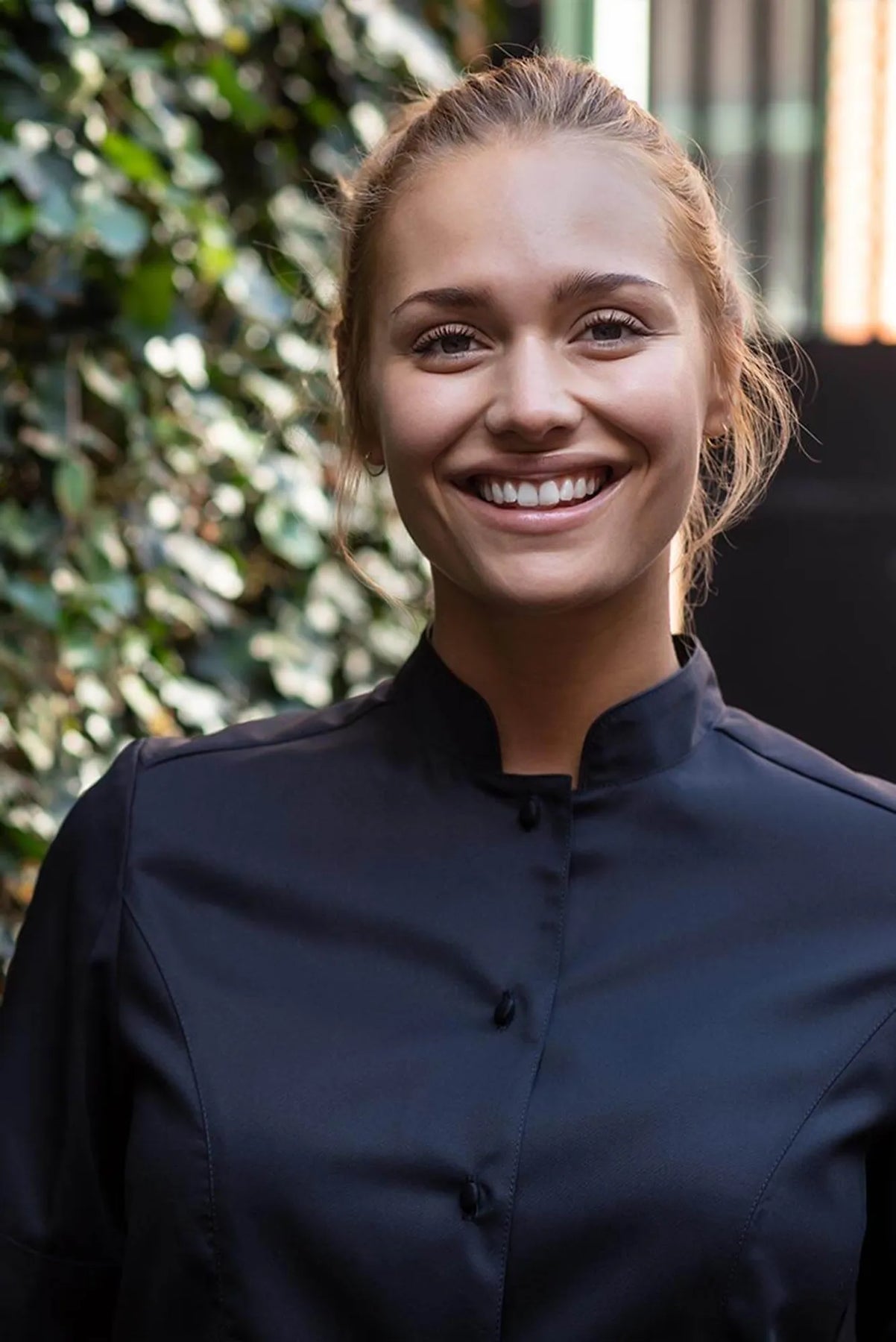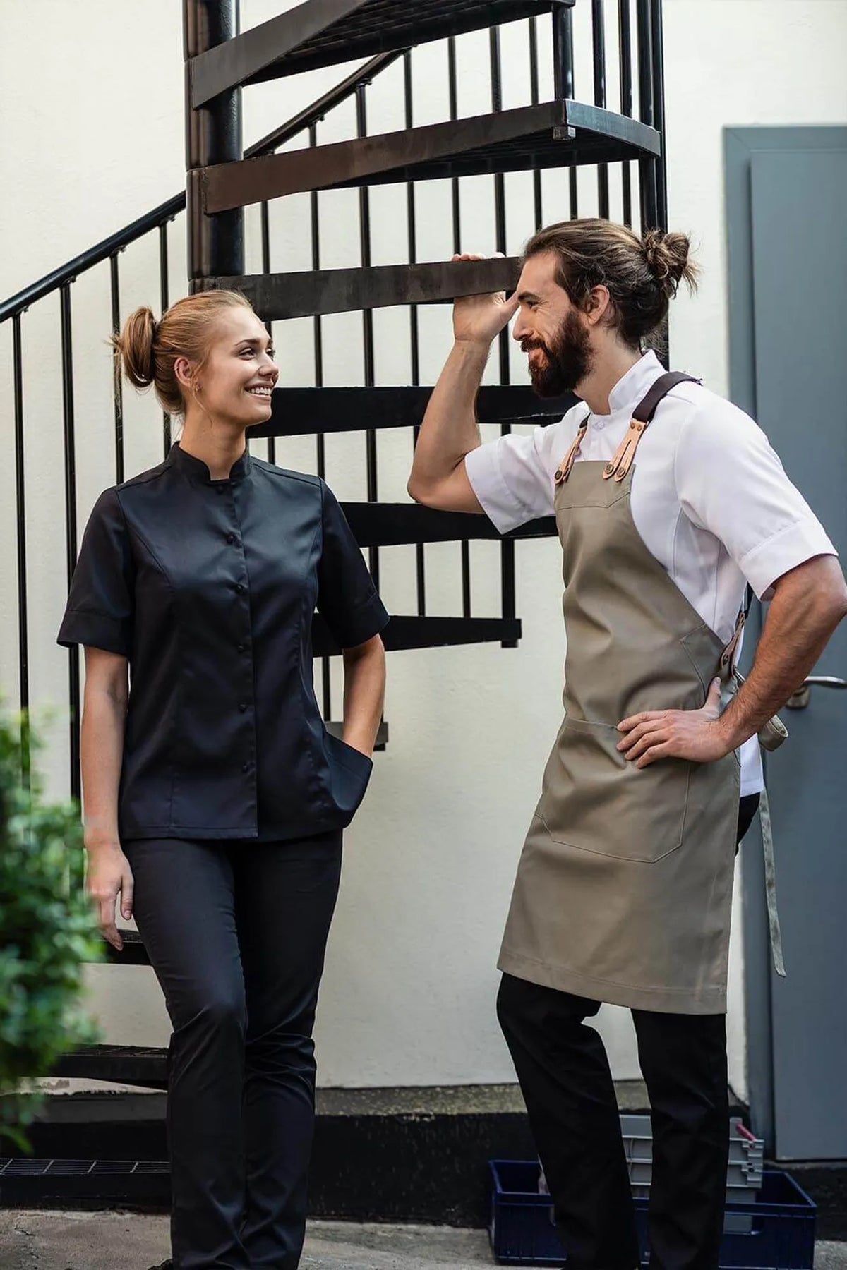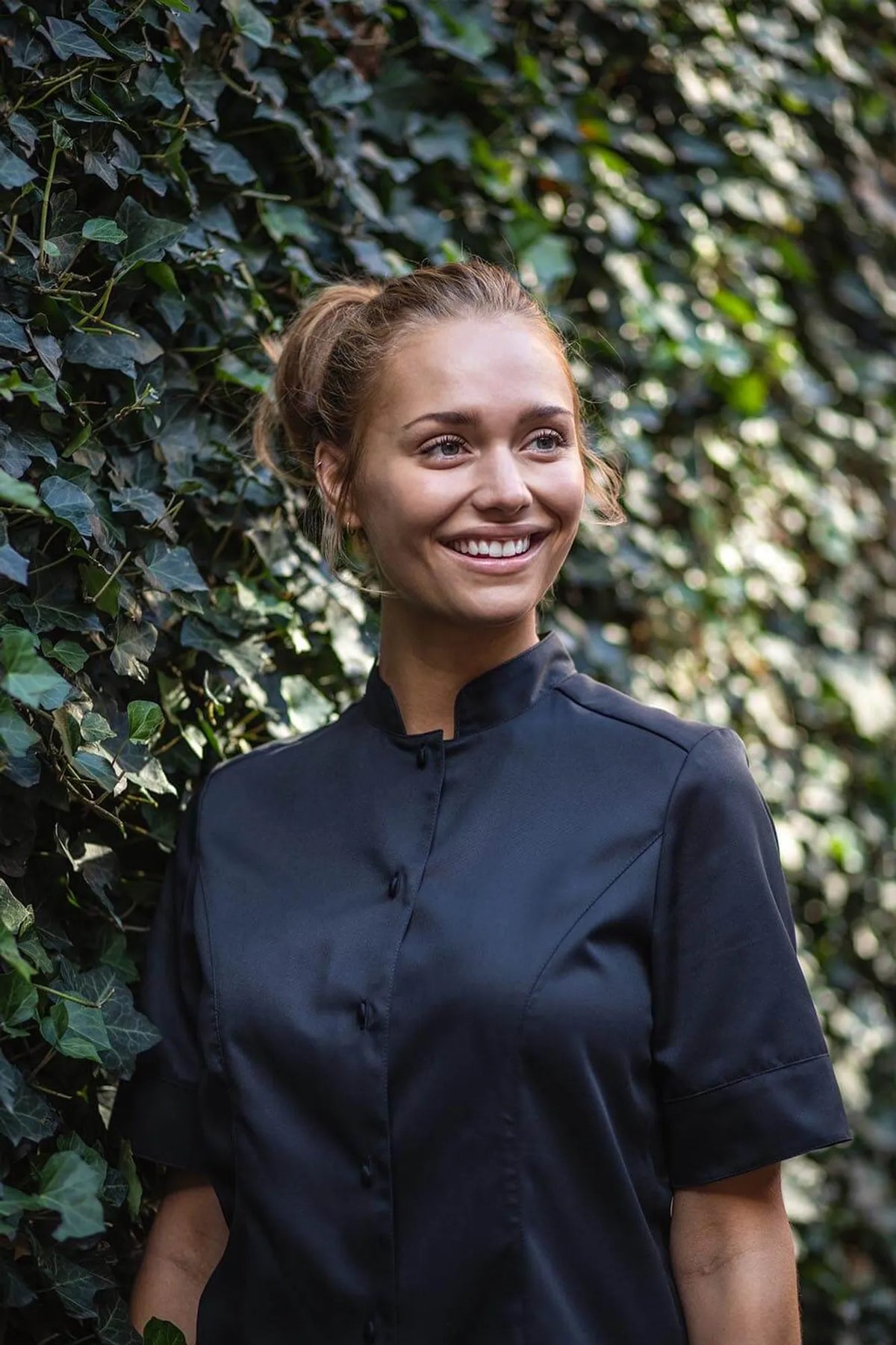 A women’s chef shirt with short sleeves and a slightly slimmer fit